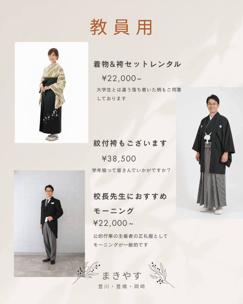 豊川、豊橋、岡崎店 教員(先生)用卒業式衣裳レンタルのご案内